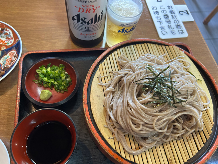 前日の二日酔いを引きずりつつ生ビールセットを。選べるおつまみは馬肉煮込み(これがビールに合いまくり)、蕎麦もついています。広い店内で家族、一人飲み、それぞれ楽しんでる感じも良い。