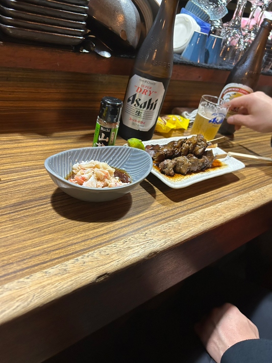 注文する隙すらなく、頼んだのはビール数本のみ。つまみといえば、お通しと称して出てきたレバー串とカニカマだけ。味の感想を言う余地もないけど、どうしたって記憶に残る酒場でした。