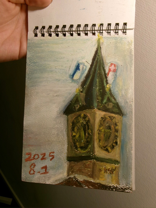 今回の旅ではチューリッヒにある時計台と、船でルツェルン湖を渡っていた時に観た景色を描きました。絵を描くって最低でも30分くらいかかっちゃって、せっかくの旅先での貴重な時間をもったいないと思う人もいるかもしれないけど、ひとつの景色にゆったりと時間を使うことがちょっと贅沢に感じたりもします。