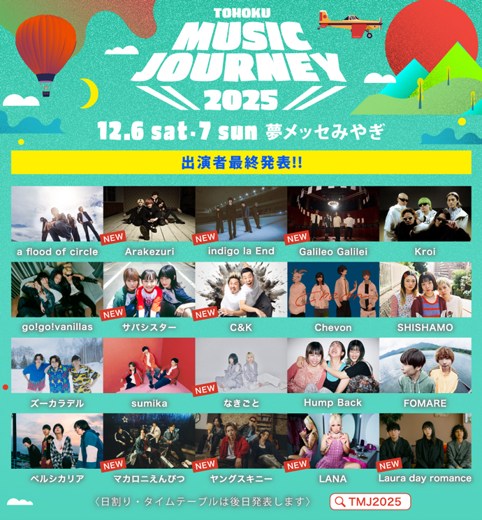"東北の冬に屋内で音楽を楽しむ"ことを目指してスタートした"TOHOKU MUSIC JOURNEY"も、今年で3回目。12月6日、7日に夢メッセみやぎ(展示ホールA、B、C)という、お馴染みの時期/会場で開催される。毎年、冬休みやお正月休みには各地で様々なフェスやイベントが開催されているため、"どれに行こうか迷ってしまう"のが正直なところ。また、その時期は帰省や家族旅行等、毎年恒例の予定が決まっている人も多い。その点、12月の最初の土日なら、まだ日常と地続きのスケジュール。休みなのに意外と忙しい年末に縛られずに、フライングでお祭り気分が味わえる絶妙な日程と言えるだろう。