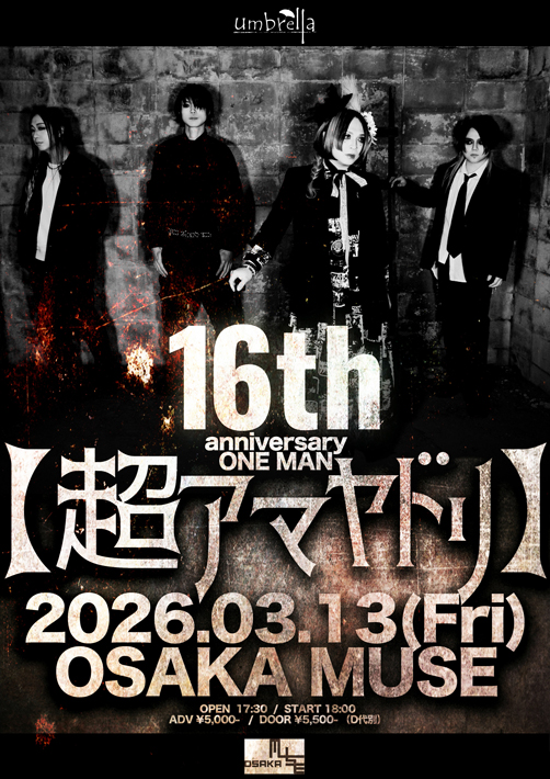 -「レヴ」はumbrellaの今と歴史が凝縮された一曲なのですね。かくして、来たる3月13日にはOSAKA MUSEで"umbrella 16th anniversary ONE MAN 【超アマヤドリ】"が開催されるわけですが、ここでライヴ・バンド umbrellaの持つ武器とはなんなのか、ということついても皆さんから語っていただけますと幸いです。