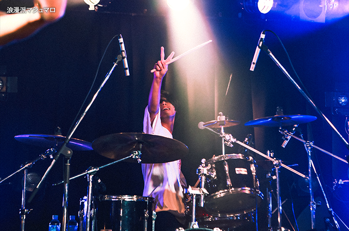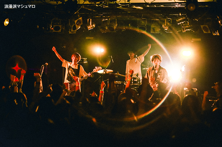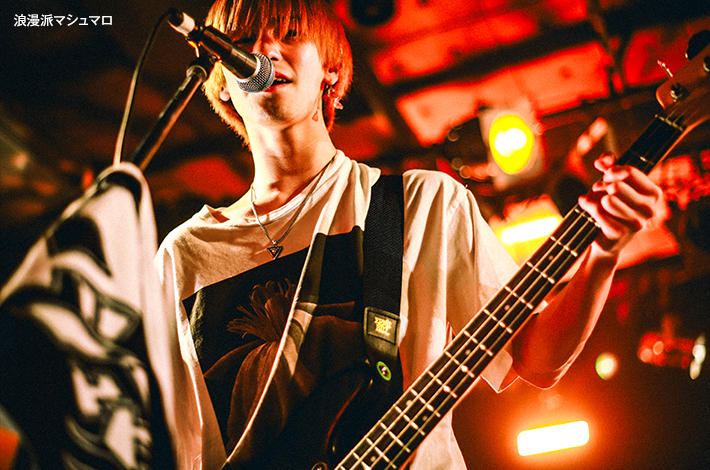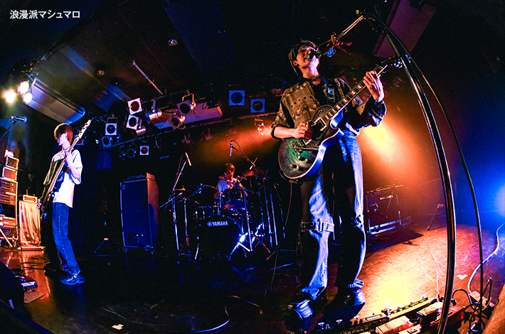 美日、パーカーズからのバトンを受け取った浪漫派マシュマロは登場からフロアの全員を掴みにいく勢い。北海道釧路市出身の椎崎楓馬(Dr)と万結(Vo/Gt)が上京後活動の拠点とした下北沢の中でも、最もブッキング・ライヴに出演してきたのがLIVEHOLICなのだ。もちろん雨月毎夜(Ba)加入後も出演を重ねてきた。