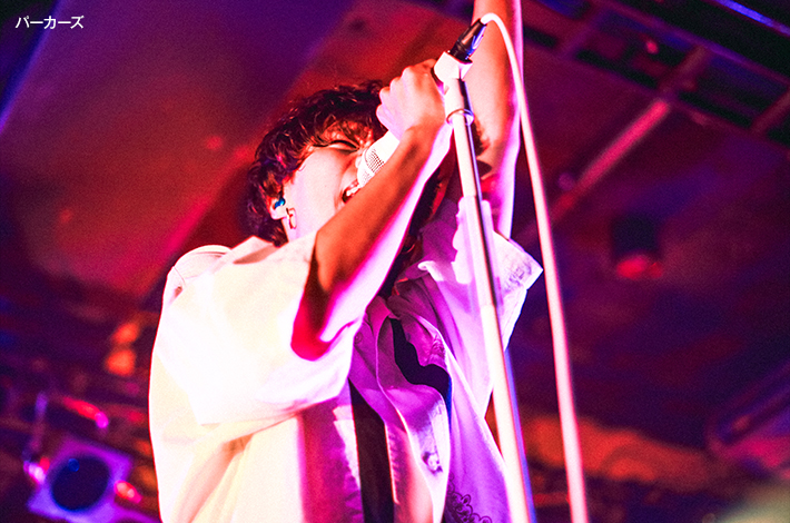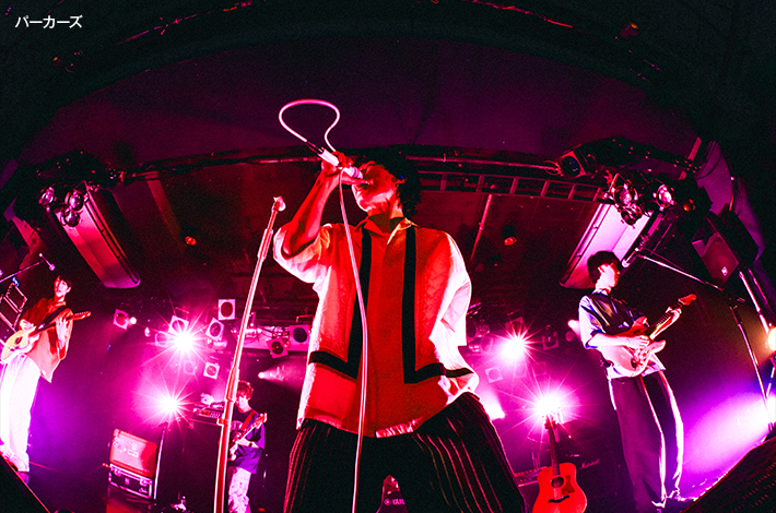 続いては"POPS日本代表"を掲げるパーカーズ。"優しいことはカッコいい"というマインドが音楽から伝わる彼等は、目下10月1日リリースの3rdミニ・アルバム『HUG』のリリースを控えるなか、対バンや秋のサーキット・イベントに邁進中。この日はLIVEHOLICでの対バン等を通じてそれぞれの個性を伸ばしてきた浪漫派マシュマロとの共演とあって、演奏の熱量もエピソード・トークも大いに盛り上がった。タイトルをシンガロングしたくなる1曲目に相応しい「君が好き」では、華のあるギターのツートップ、ナオキとねたろがお立ち台に上がるシンプルな演出が効果絶大。ポップなロックンロールと見せ方の相性が抜群にいいのだ。ごきげんなR&Rは新曲「トマトジュース」で加速。ナオキのマシンガンギターも冴え、「怪獣万歳!」ではハンドマイクにスイッチした豊田賢一郎(Vo/Gt)が熱くなるフロアにワイパーを促すと、全員参加の大きな波が現れた。MCではイベントを祝う言葉に続き、初めてパーカーズを観る人に"ノリ方分かりませんよね? でも俺たち楽しみたいので煽ります!"と宣言。言葉通り、続く「ハッピーをちょうだい」では手をなるべく高く挙げるように声を掛け、これまたほぼ全員参加のクラップが乾いたいい音を鳴らす。初めて彼等を観る人も自然と輪に入れる、すごくナチュラルな流れが楽しい。フロント3人のユニゾンするヴォーカル等のアレンジで見せ場も盛りだくさん。すっかりフロアが温まったところに、新曲で3rdミニ・アルバムのタイトルに通じる「Hug me!!」を披露してくれる。同期のピアノ・リフやビートがモータウン・ソウル調で、パーカーズの新しいフックになりそうな曲だ。