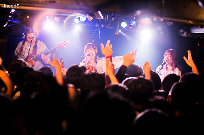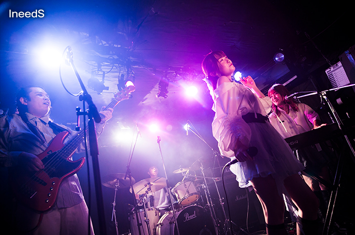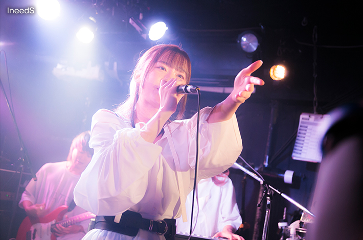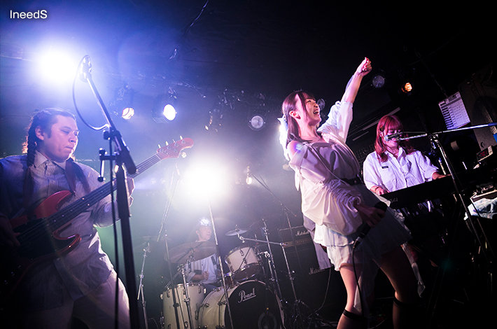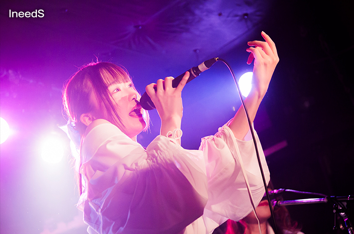 ArinaがMCで"エゴサしていたら"(次の曲は)飛びポ(ジャンプするポイント)がある"って言っている人がいて......"と切り出し、さらに客席にその本人を見つけると会場はどっと笑いに包まれた。アーティストと観客の距離がぐっと近付いた、そんな微笑ましい瞬間の後に披露された「Endless Blue」では、先程のMCを有言実行するかのように、大サビで観客が同時に飛び上がり、まるで天井に届かんばかりのジャンプでフロアを揺らす。筆者は、初ライヴだった"恋せよ2025([LIVEHOLIC presents. "恋せよ男子2025" supported by 激ロック & Skream!])"を観ていたため、ライヴ・パフォーマンスの成長に圧倒されると共に、確かにIneedSの "今"を観ることができた。