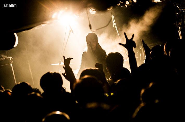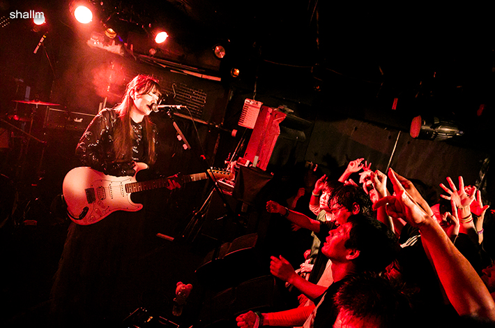 IneedSの熱気に包まれながら、続いてshallmのステージがスタートした。最初に披露したのは「境界戦」。走り抜けるサウンドに応えるかのように、観客は一挙に前のめりになり、拳を突き上げる。shallmの開演直後とは思えない程、会場の温度が一気に上がった。続く「虚飾のキス」では妖艶なメロディに合わせて身体を揺らし、「G2G」ではスピード感溢れるリズムに合わせて観客がジャンプし、ステージと客席の距離が一気に縮まる。会場中に歓声と手拍子が鳴り響き、まるで大きな波が押し寄せるような熱狂が生まれていた。