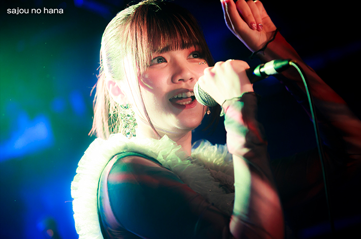 海外のライヴ・イベントにも参加しているsajou no hana。少し長めのMCでは、ドイツのヴィースバーデンで開催された"Connichi 2025"の帰路での面白エピソードを話し、会場全体が笑顔で溢れた。そしてsanaが初作詞した「THE IOLITE」では、きらめく旋律と力強いグルーヴが重なり、観客が一体となり拳を振り上げる。青い照明がステージを染め上げ、楽曲タイトルそのものを視覚的に表現しているかのようだった。そしてバラード「切り傷」では、透き通る歌声に思わず息を呑み、その繊細且つ力強いライヴ・パフォーマンスに圧倒された。