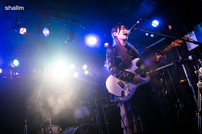 lia(Vo)が、改めて下北沢LIVEHOLICの10周年を祝い、さらにshallmがライヴ前日に3周年を迎えたことを伝えると、客席からは温かな"おめでとう"の声が飛ぶ。その言葉を受け取ったliaは、満面の笑みを浮かべながら深く頷き、会場全体が祝福の空気に包まれた。そして、10周年のLIVEHOLICに向けて歌う「トワイライト」が始まる。"ずっとずっと側にいてよ"という歌詞が、これからのLIVEHOLICとの歩みや、この場に集った観客との特別な繋がりを象徴しているかのように響く。「センチメンタル☆ラッキーガール」が鳴り出すと、待っていましたとばかりに手拍子が揃い、さらに「アイ・ラブ・ジェー・ケー・キス・デート」では、ストレートなロック・サウンドが響き渡るなか、観客がクラップで応え、サビではミュージック・ビデオでお馴染みの指占いの振付がフロアに広がった。