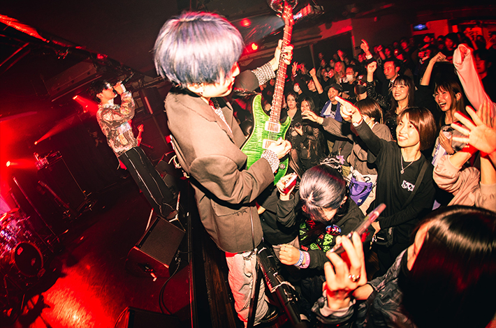 穏やかな余韻を一変させるようなKanatoのギター・ソロから、「Face My Fate」でライヴは後半戦へ。ここでKanatoのギター・ストラップが外れてしまうハプニングが発生したのだが、直前のMCでスペアのギターに対する愛着を語っていたこともあって、まるで運命の悪戯のようにフロアのボルテージを高めていく。「STEP」では特大のシンガロングが響き渡り、歌詞のカウントに合わせて指を折りながらリズムを刻む姿がフロア中に広がっていった。演奏を終えるとMotokichiは"今日ソールド・アウトできなかったのが悔しくて......"と正直な胸の内を語りつつ、先程の光景を振り返りながら"皆さんから特大の愛を貰いました"と集まったファンに深い感謝を伝える。ダンスと合唱が会場を揺らした「One More Time」、ラウド&ダークな音圧が轟く「27club」でバンドと観客とがお互いをぶつけ合ったところで、ラストはEP『CITY ROCK』を締めくくる「Sunrise」。新しい一日へと向かう人々を後押しするようなポジティヴなサウンドに乗せて、この日一番の大合唱が響き渡っていた。アンコールの「Memories」ではJellow GlowのKoto(Vo)もゲスト参加し、多幸感溢れるクライマックスを演出。全員に手を挙げるよう促したMotokichiは、"ここで手を掲げたこと、絶対後悔させません!"と力強く語り、ファンとの絆を再確認しながら未来への展望を示しステージを締めくくった。
