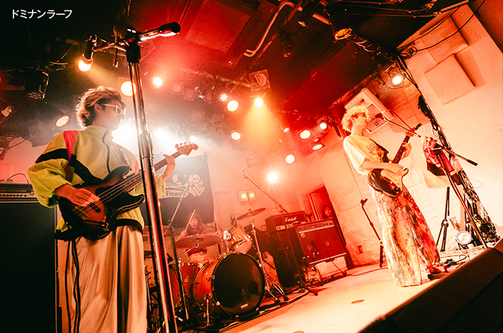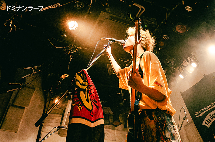そして主催のThe Gentle Flower.へ。金子はフロアに向けて"あなたを含めた仲間と呼べる全員で新たな未来の幕開けを始めましょう! 「Light up」ホスト、群馬からThe Gentle Flower.始めます!"と叫び、「有名になったら」からスタート。何よりも雄弁に"これからも共に"という誓いを感じる曲だ。加えて、すでに多幸感が溢れて無敵モードの4人のライヴは、観ているこちらも今日の疲れとか日々の鬱憤とか、そういうものを忘れて盛り上がることができた。続けて新曲「シノプティコン」を投下。彼等のまっすぐなイメージとは違ったサイケ感のあるサウンドが本能を刺激する。そのままノンストップで繋いだ「YELLOW」では"今日イチ見せてもらっていいですかー! マジで革命起こそうな!"とさらに煽る金子。森下も尾崎 匠(Ba)もいつステージから落ちてもおかしくないくらいアグレッシヴだし、マナム(Dr)も後方からそのエネルギーをさらに後押しする、バンドのエンジンのようなドラムだ。フロアもクラップや、サビでは"せーの!"の合図で多くのハンズ・アップで応えた。4人は楽しすぎて予定外の「片足の少年」も披露。その衝動はステージ上でも見られ、金子と森下がお立ち台にいる間に、尾崎が空いたスペースにダイブ! マナムも含め気持ちが全面に出ていた。そしてMCで"出てくれた仲間や今日来てくれたあなたのことを忘れず、嘘をつかないでいつでもまっすぐに愛を込めて歌っていきます!"と伝え、このかけがえのない時間を抱きしめながら愛を伝えるバラード「Y」で本編を終了した。