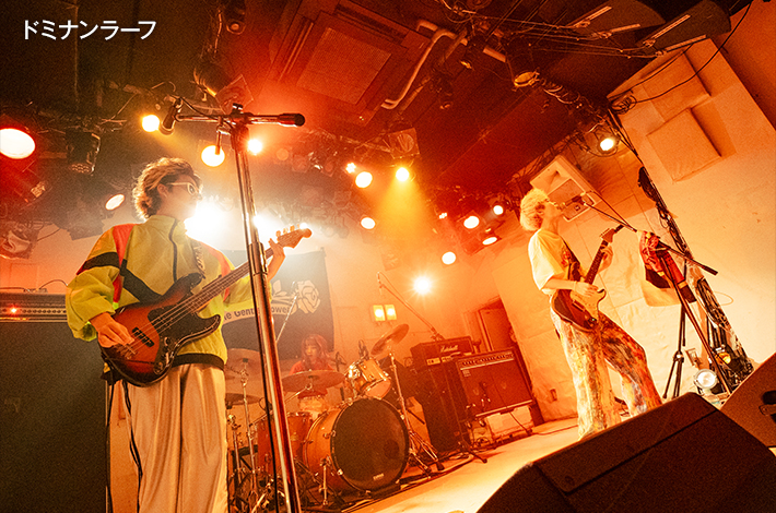 MOSAiCのトッパーは新潟の盟友 ドミナンラーフ。1曲目「才能人」から力強さとキャッチーさを兼ね備えたバンド・サウンドを響かせると、曲が進むにつれてクラップやハンズ・アップが増えていく。さっそく心を掴むとふじとわ!(Gt/Vo)は"やることは1つだけ! トッパーを任されたからには爆弾を落として帰ります!"とさらにギアを上げて、「ハーモナイズ」と「君と陽炎」を届けた。抑えられない勢いとジェントルへの愛が重なった結果、最後の「スーパーロックバンド!!」でふじとわ!はフロアに降りて衝動的に演奏。ギターのストラップが取れてもお構いなしだ。最後はジェントルの金子と肩を組み、"伝説の始まり!"と叫んで終了した。