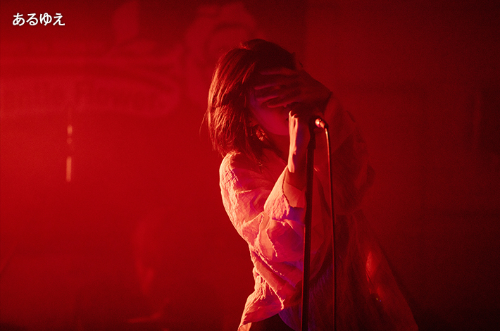 あるゆえは攻撃的且つ表現力の高いステージングでどんどん魅了していく。MOSAiCの照明との相性もばっちりで、彼等の持つ熱やドラマチックさをさらに高めていく。この音を浴びれば雑念を持つ隙間等ない、そんな時間だ。MCで"今日は革命を起こす日!"と紫月(Vo)は話したが、その革命はいつだってここから始まると言わんばかりの「ライブハウス」では、フロアもつられて全ての感情を思い思いに解放する。そんな親愛なるフロアと作った「讃美歌」の合唱は、この日のハイライトの1つになった。