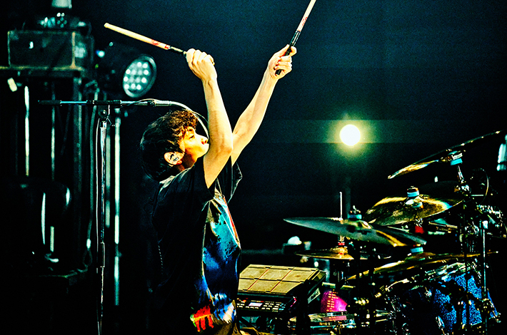 終盤もアルバムから怒涛の展開。まるで初期曲のようなブラストビートの「overtime」は、しかし今のエクストリームな側面で確実にアップデートされている。それは「DEAD」にも接続し、マイナー・チューンのヒリヒリする感覚はブルエンの1つの十八番だが、その最新版「chang[e]」はやはり武器が多い感じだ。そしてハード且つフェティッシュなギター・リフが危機感を煽る「囮囚」ではエクストリームな重奏の渦に巻き込まれ、エンディングはマシンガンのような高村のプレイでフィニッシュ。隙のないライヴ・アレンジが見事と言うほかない。