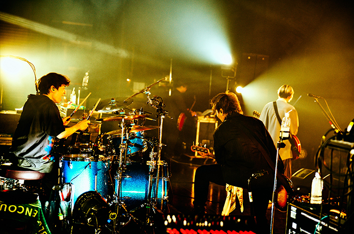 "アルバム・リリースからほぼ1年経ったんだよね? 久々に小箱も回る全国ツアーで、いつもは俺がセットリストを決めるんだけど、後半はみんなの力も借りたリクエスト・コーナー"と田邊が言った途端の歓声の大きさったらない。"まずはレア曲を"と始まったパンク/エモコアなシンプルさゆえに強力な「DESTINATION」で、フロアはいい意味で獰猛さを加速させる。自然と自分を解放して、全力で挑んでいる感じだ。さらに隠れたユニークな激烈ナンバー「HOPE」。江口の特徴的なリフが痛快にフリーク・アウトを誘い、高村佳秀の正確無比なブラストビートに煽られる。ビートは激しさを保ちながら、気持ちを乗せられる「青」がドロップされる。田邊が"「今をもっと愛してやれよ」"の箇所でフロアにマイクを向け、どデカいシンガロングが起きた。この曲の演奏で、過去曲でもバンドとファンが作るツアーを実感することができ、ツアー後半のセットリストの意味を見た気がする。さらに前半のハイライトは、江口と田邊の繊細なギター・アンサンブルが聴きどころの「EVE」。後で2人とも大いに緊張したことを告白していたのも納得。ライヴの披露がレアなことに加えて、曲調がガラッと変化するセットリストだけに気持ちの切り替えも必要だと想像できるからだ。