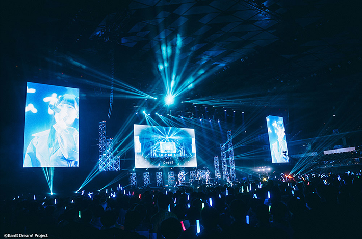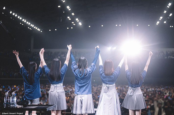 アンコールで再びステージに姿を現してからは、ミッド・テンポの「歩拾道」で会場全体をリラックスした空気にシフト。MCでは役を離れたいちプレイヤーとしての自己紹介とトークを繰り広げる。ここまでの作り上げられた世界観とはまた違う、緊張が程良く解けた等身大のメンバーの姿を見せながらそれぞれの想いが語られる。中でも小日向美香(そよ役/Ba)が感情を発露させながら、2024年の"MyGO!!!!! 7th LIVE「こたえなんてなくても」"に出演できなかったことに触れ、"キャラも含めた10人で無事にステージに立てたこと"への感謝を伝えたときのオーディエンスからの返答がこの日一番の音量で、ここにもキャラ、キャスト、ファンのストーリーが深く刻まれていることが示されていた。