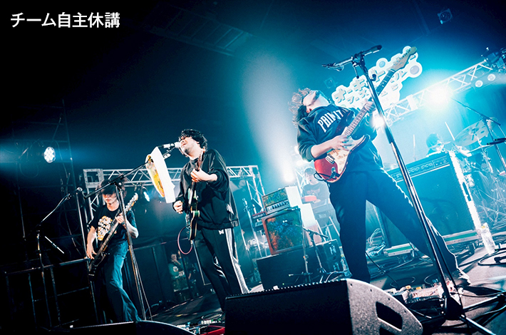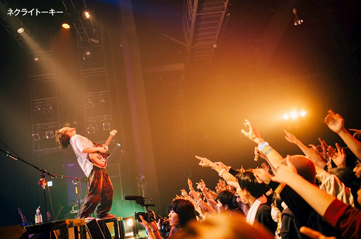 秋晴れに恵まれた日曜日。豊洲PITの場内外には出演バンドののぼりやフォト・スポット、キッチンカー等が並び、満員の場内はライヴのスタートを今か今かと待ち構えている。12時55分、ネクライトーキーのメンバーが登場すると、緊張気味のもっさ(Vo/Gt)をメンバーが励ましながらの開会宣言。"いつか開催したいと思ってたんですけど、今日がその日になりました。尊敬する先輩や同期が二つ返事で出てくださいました"と、夢の実現と心からの感謝が手に取るように伝わり、大歓声が場内を包む。朝日(Gt)だけはトッパーのチーム自主休講のステージに急ぐため、若干心ここにあらずだ。では、メンバーが特設サイトに寄せたコメントも盛り込みながらレポートしていこう。