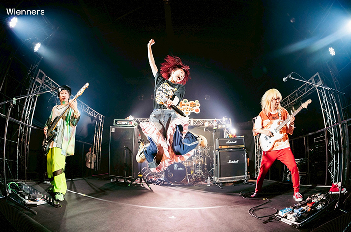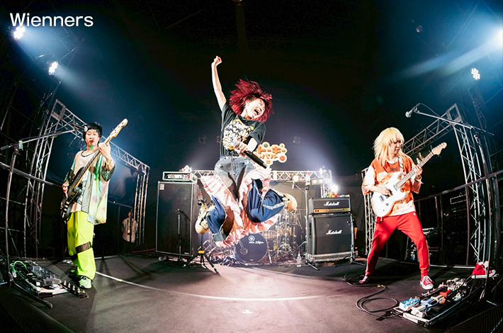 続く"シビれるステージ"には、中村郁香(Key)が"玉屋さん風にたとえると太陽神スーリヤ"みたいだというバンド Wiennersが登場。この日はゲスト・ヴォーカルにピンキー!こと藤咲彩音(ex-でんぱ組.inc)を迎えて、本編は和テイストな4つ打ちダンス・ロック「SHINOBI TOP SECRET」でスタート。太陽神に例えられたことから"太陽みたいなバンド Wiennersはこの曲で!"と玉屋2060%(Vo/Gt)が明るく煽ると「SOLAR KIDS」へ。サンバからブラストビートまで満載したキメラ展開に爆発的なリアクションが起きる。ピンキー!の脳天から発せられるヴォイスもWiennersのハイパーな世界観にマッチしていてすごくいい。"生きてるっていうのは心臓が動いてるっていう生物学的なことじゃない。心が動いてるってこと! 俺たちの生きてる証の歌!"と、「蒼天ディライト」、「GOD SAVE THE MUSIC」で生きる歓びを全力で表現。サウンド・チェックを含めるとなんと12曲を詰め込む濃厚セットリストで、明るい混沌を作り出したのだった。