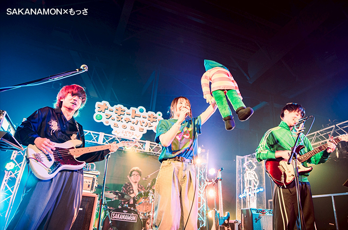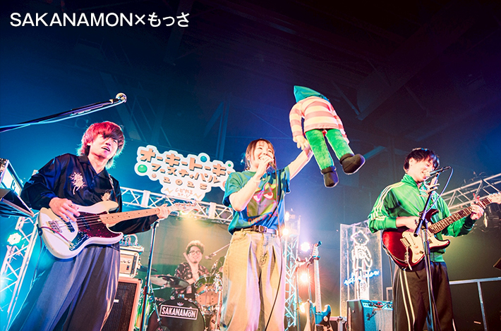 スピーディな展開もこのフェスの素晴らしいところで、10分間隔で次は"イケてるステージ"にKANA-BOONが登場。ご存知の通り朝日と谷口 鮪(Vo/Gt)は20歳頃からの付き合い。紆余曲折ありながらバンドを続けられているのはKANA-BOONの存在が大きいようだ。登場してすぐ"「イケてるステージ」で一番イケてる俺たちがトップバッター!"と煽ってくる谷口の一言から「フルドライブ」でブチ上げてくる。ソリッドなポストパンク調で谷口のラップが冴えるKANA-BOON流ミクスチャー「FLYERS」、彼等が邦ロックに打ち立てた四つ打ちナンバーを更新した印象の「SUPERNOVA」等を連投。フロントのメンバー全員がアクティヴに魅せるステージングも心が躍る。谷口が"トーキーとは15年来の付き合い"と話し始めたところにもっさが登場。5年前の"THE FIRST TAKE"での共演でもっさおよびネクライトーキーを知った人もいるであろう、「ないものねだり」のライヴ・バージョンがこの日実現した。ステージ袖で声を掛けてほしそうにしていた朝日もギターで参加。朝日と谷口は言葉を交わすより演奏でこの日を祝っているように感じられたのだった。