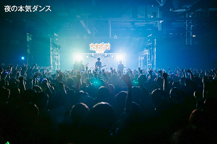 フェスも終盤に向かうなか、立て続けに踊れるロック・バンドが続くのも主催の意図なら慧眼だ。夜の本気ダンスのサウンド・チェックが始まると"シビれるステージ"がロンドンのクラブのような空気感を纏う。ソリッドなギター・リフが痛快この上ない「WHERE?」で初っ端からコール&レスポンスして徐々にオーディエンスを巻き込み、特にセオリーのない各々のノリ方でフロアが温まっていく。実は"オーキートーキーフェス"は夜ダン15周年記念の"夜の本気ダンス presents「KYOTO-O-BAN-DOSS」"がきっかけだと藤田(Ba)がコメントしていたが、この日のライヴでもそのことを米田貴紀(Vo/Gt)も力説し、大いに拍手と歓声を集めていた。ポストパンクもグルーヴィなファンク・テイストもポップに昇華して思わず踊らずにはいられない楽曲のパワーもすごいが、ステージ上ではポップ・スターに変貌する米田の、いい意味で音楽にとっ捕まってしまったキャラクターを愛さずにいられない。さらに出演バンドをイジる以上の煽りで盛り上げる。"踊れない夜を知らないバンド、夜の本気ダンスですけど知ってますか?"と、脱力気味のキャラの鈴鹿秋斗(Dr)が言うから余計に笑ってしまう。「Crazy Dancer」でフィニッシュし、"それでは踊ってない夜を知らないご本人の登場です"と前説(?)までして、フェス終盤のムードをブーストするのだった。