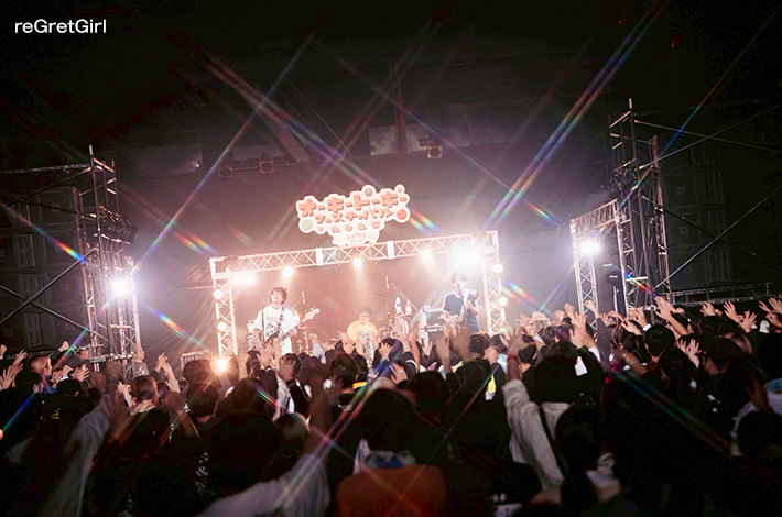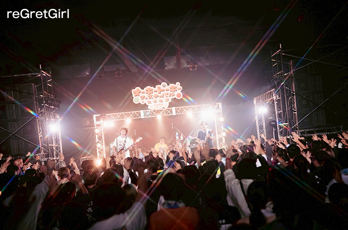 大トリのネクライトーキーを前に、しばしの休憩にフロアを出るオーディエンスもいる、若干不利な状況を覆していったreGretGirl。ネクライトーキーとはレーベルメイトであり、もっさは過去、どこか俯瞰的だった自分がreGretGirlの歌の熱量や感情の生々しさをリアルに感じ、自己表現の真摯さを受け取ったとコメントしている。そう、その熱量は今彼等がいる状況でも発揮されたのだ。平部雅洋(Vo/Gt)は開演時からライヴを観ていて、"もう6時間待ってて。KANA-BOONとWiennersは楽屋で打ち上げ始めてる"と状況説明。フロアの笑いを引き寄せるように「Shunari」でスタートし、曲を知らないリスナーでもノレるであろうファストな「after」を続け、徐々にフロアが温まってくる。さらに痛快なラップで関西人は使いがちなワード"知らんけど"を仕事や日常の場面に盛り込む新機軸ナンバー「知らんけど」も披露。"お前らなんかやり遂げる気がするで/知らんけど"というフレーズは盟友 ネクライトーキーへの賛辞に聴こえなくもない。"シビれるステージ"のトリを任せてもらったことを1日中考えていたという平部の一旦の答えは"バンドは続けるだけで偉い"というもの。なんだか原点に立ち返るような一言から、彼等の切実さを代表するナンバー「デイドリーム」と「ホワイトアウト」を連投し、締めくくりに人間全肯定ナンバー「KAWAII」で場を笑顔にするという、リグレ濃縮版の35分を走り切った。