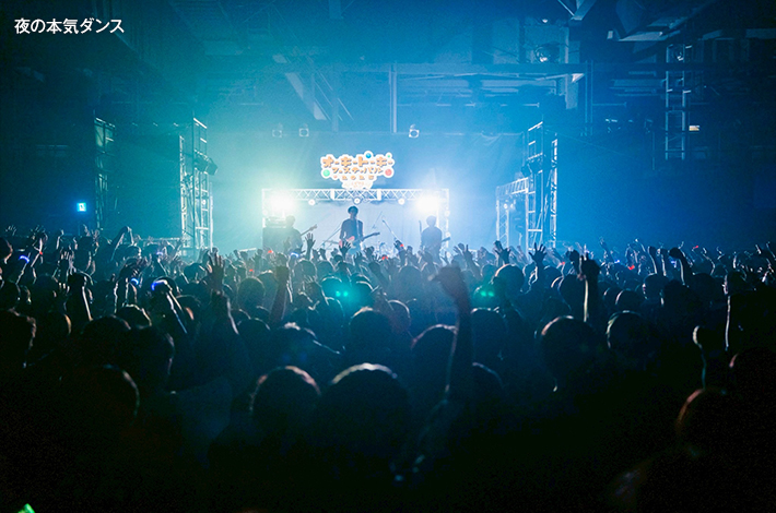 祝祭的なムードはPEDROのオルタナティヴなサウンドがいい意味でビシッと締めてくれた印象だ。"PEDROです。よろしくどうぞ!"とアユニ・D(Ba/Vo)が自己紹介し、「1999」でライヴをスタート。チーム自主休講に続き2ステージ目と思えないパワフルさのゆーまお、1音/1フレーズの説得力がさすがと言うほかない田渕ひさ子(Gt)、ベース&ヴォーカルとして確かな存在感を作り上げたアユニ・Dからなる3ピース・サウンドに引き込まれる。そして"泣いて食った飯の数と/必死に恥かいた日々を/希望と呼ばずになんと呼ぶ"、そんな歌詞はネクライトーキーともたしかに共振する。朝日が"美学と覚悟を持って歩み続けることが、バンドとしての姿勢の良さに繋がる"ことを教えられたとコメントしたのも納得だ。3曲目に演奏した「音楽」は朝日がアレンジで参加したナンバーであり、そのことも受けアユニが"朝日さんの作る曲に中学生の頃から救われてきました。今こうして初めてのフェスに呼んでもらって嬉しいです"と、清々しい表情で話した。ハンドマイクでの「いたいのとんでけ」では自在にパフォーマンスし、身体表現の高さでも魅せる。"一番楽しんでやろうと思ってます"という言葉通り、ネクライトーキー、そして音楽への愛を解き放つことでこの日を祝福していた。