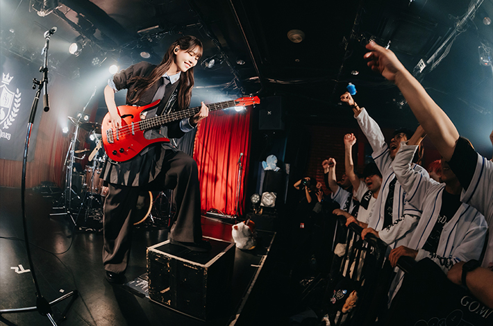 この日のライヴは、3人にとって始まりの曲である「タイトル一緒のダイアリー」からスタート。フロアからオイコールが上がるなか、瑞々しいバンド・サウンドを高鳴らす3人。先に行ったインタビュー(※2025年8月号掲載)で、YUNAとCOCOはAnother Diaryを結成してからそれぞれのパート楽器を本格的に始めたと明かしていたが、そうとは思えない程に堂々としている。YUNAとCOCOがステージ前まで飛び出して音を鳴らすと、そんな2人に視線を送りながらGOMIは楽しそうにビートを刻んでいた。曲を終えると、煽り担当のCOCOが"緊張している人いるんじゃない?"と焚き付け、GOMIが"楽しむ準備はできてますか!?"とフロアを盛り上げると、YUNAは"足つっちゃってるんだけど(苦笑)"とマイペースながらも笑いを交えつつ、「My Name Is Malguem」(QWERカバー)へ。笑みを浮かべながらフロアに音を届けると、間髪いれずに怪しさを纏った「くちばし」になだれ込む。YUNAが凄まじい勢いで言葉を畳み掛けていけば、途中でCOCOがGOMIのところまで駆け寄ってキメを合わせるという、力強いパフォーマンスでも魅せていた。