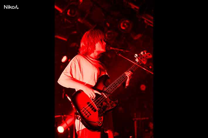 ホストのNikoんは47都道府県ツアーのおよそ3分の2を回ってきたタイミング。無駄を削ぎ落とした、人間が出す音の極み、そしてトライアングルの屈強さが際立つ。そして何よりマナミオーガキ(Ba/Vo)の覚醒を見た。筆者は昨年8月に同会場でNo Busesとの対バンで見て以来だが、盟友と醸成したあのときのグルーヴ感とは決定的に違う、硬質なサウンドと意志を見たのだ。