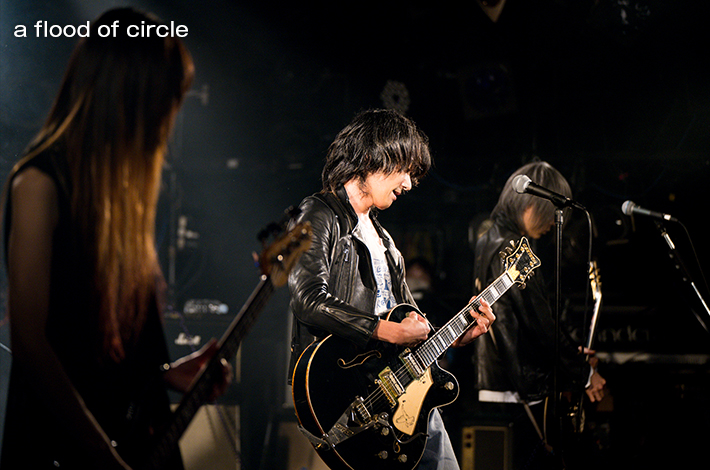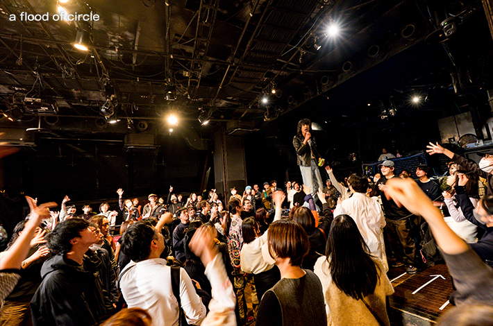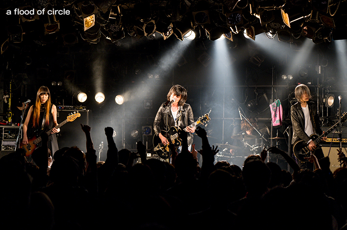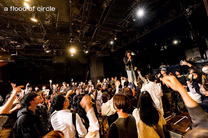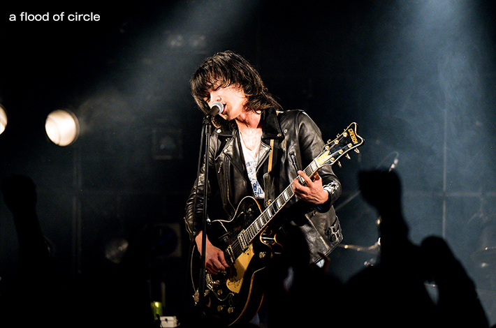 "ROAD TO武道館Tシャツ"も散見されるフロアは、a flood of circleファンもかなり多いと見た。この日の2日前、"日本武道館への道"をスタートさせた彼等は怒濤のライヴ三昧である。ツアーのネタバレはできないが、この日のセットリストはガラッと違う内容だ。ただ、ステージに佐々木亮介が1人で現れて、ブラックファルコンの弾き語りで始めるのは同様だった。