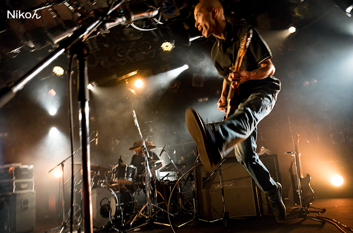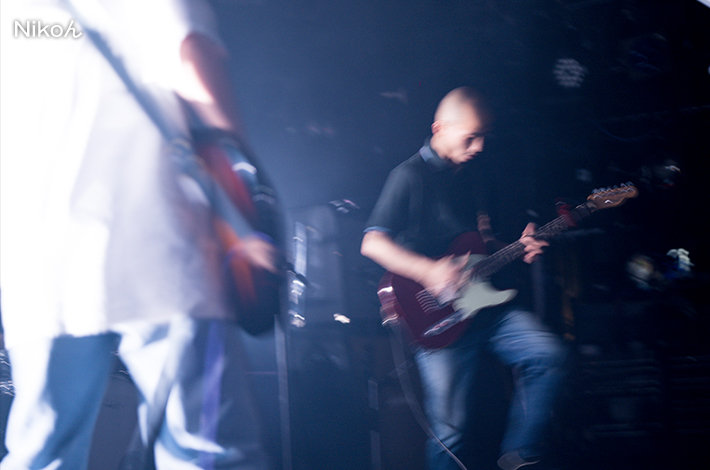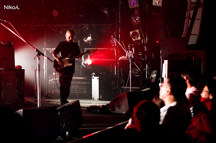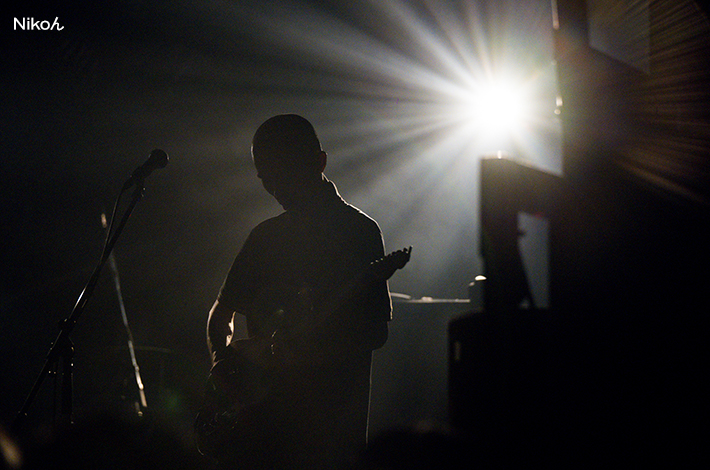 中盤は、"こんなに体力を消耗するライヴなのに、出てる音は美しいぐらいにどこまでもクリアで硬質"というNikoんの特徴が最大限に拡張。ひたひた迫る「ghost」から、3ピースと思えない程の重厚感とトランス感を生み出した「Vision-2」。この2曲のライヴでの育ちっぷりに瞠目させられた。さらにJ-POPの歌メロにあってもおかしくないメロディと、それを伝えるオーガキの声がスッと入ってくる「bend」では、同時にオオスカの端正なカッティングがセンスの塊になって、パッと聴きポップな曲をNikoんだけのバランスに昇華する。キャッチーであることを恐れないのは、たぶんバンド・サウンドに自覚的だからなんだろう。さらにNikoんの解釈によりグッとソリッドでポストパンクな体感を獲得したフラッドの「I'M FREE」のカバーが、フラッドファンの自然なリアクションを生み出す。そこには仲良しバンドのカバーじゃあり得ない緊張感があった。