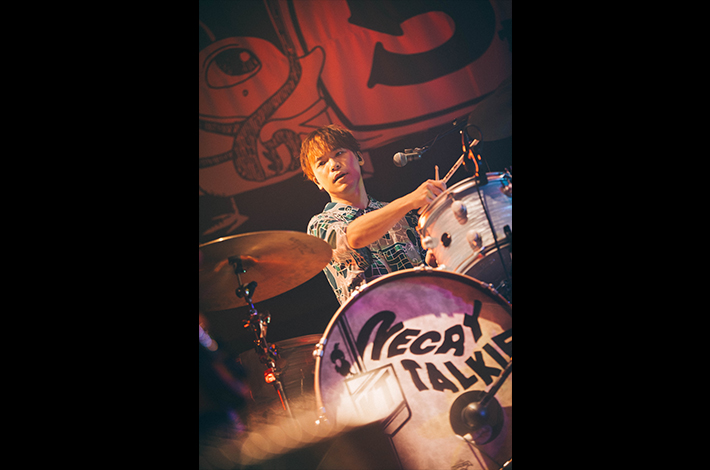 "どうでした? ネクライトーキー自慢の曲は"とフロアに問い掛けるもっさ。先程の朝日のMCにも繋がるが、誰にも書けない朝日の絶妙な曲の存在から始まったこのバンドを雄弁に表している。その世界観をアンプリファイするようなもっさの存在、全てが混ざって育っていったバンドとしてのオリジナリティ。その最新形を今見ているのだ。終盤は切なさとクールなリフを併せ持つ「ちょうぐにゃぐにゃ」、もっさと藤田のガーリー且つコミカルな掛け合いが展開する「君はいなせなガール」が飛び出し、スリリングなリズム・チェンジも挟んで、演奏の切れ味はさらに鋭さを増していく。難解なプログレ並に1つ踏み外したら崩壊しそうな構成だが、一切難しさを感じさせないところがネクライトーキーの凄みでもある。