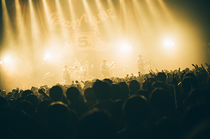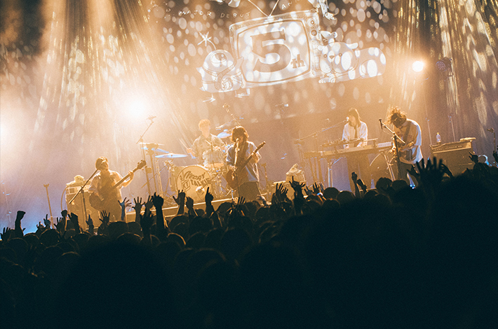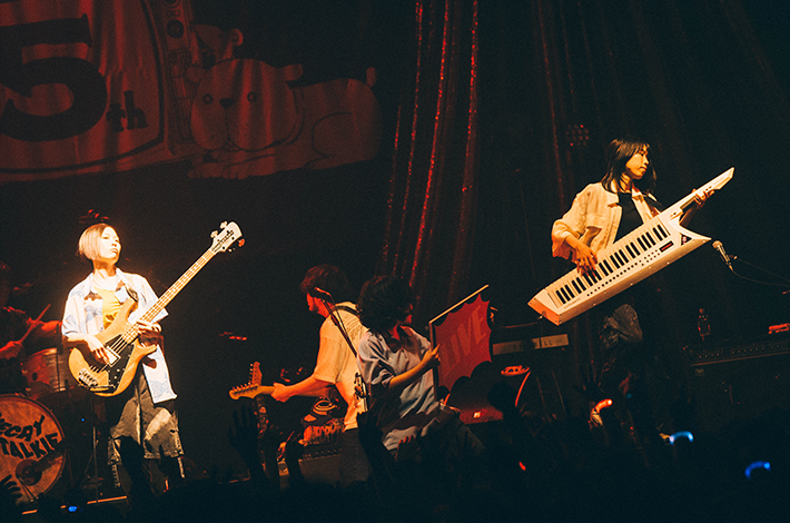 複雑な展開を乗りこなした後、おなじみの5カウントを焦らしながらフロア共々叫び、「オシャレ大作戦」のオーケストラ・ヒットが鳴り響く。疲れ知らずのファンが歌うサビでの"ヘヘイヘイ"のボリュームのデカさときたら。自分に勝ち目があるとも思えないけど、マジョリティの好みに迎合できないんだから仕方ない。そんなふうにも受け取れる曲が、今目の前でバカデカいシンガロングを起こしている。最高だ。本編ラストは「だれかとぼくら」、朝日1人の思いから始まったであろうこの曲が、バンドとしての意味を日に日に大きくしていった結果、5周年のアニバーサリーのテーマにもなった印象だ。繰り返されるもっさの"だれかとだれかとだれかとだれかと~"の熱唱は次第に絶叫になり、切実さを孕みながらも以前より包容力を増していた。このショート・チューンをライヴ・アレンジで引っ張ることなく潔く終えたのも、曲に対するスタンスなのだろう。