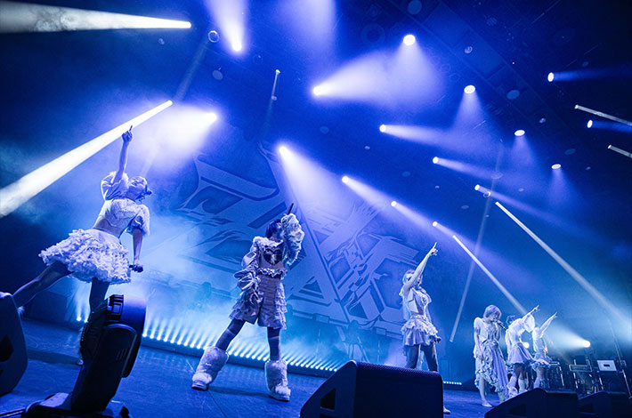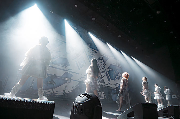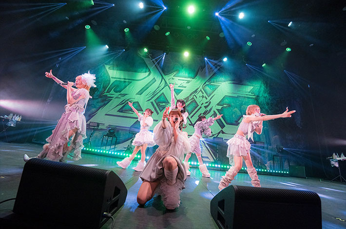ライヴ中盤も、4つ打ちのダンス・ナンバー「Tight Gee」や、メロウな「badface」、鬱と躁が巡るかのようにラップとアッパーなサビが展開する「GIRL'S GIRL」等、多彩な楽曲で披露していくが、中盤のハイライトになったのは、大森が"純心"と題したポエトリーリーディングを披露し、フロアの空気を引き締めてから披露した「CUTTING EDGE」だ。壮大なサウンドスケープの中で、6人が女の子の心の叫びを発し、聴き手の心を突き刺していく様子は圧巻だった。