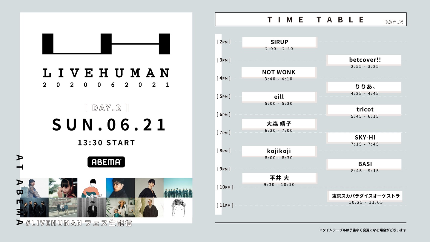 6月20日、21日の2日間、計約20時間に迫る規模でABEMA新機能"PayPerView"にて独占、且つ世界同時生配信される新オンライン音楽フェス"LIVE HUMAN 2020"が2日間全24アーティストのタイムテーブルと、最後の追加アーティストを発表した。
