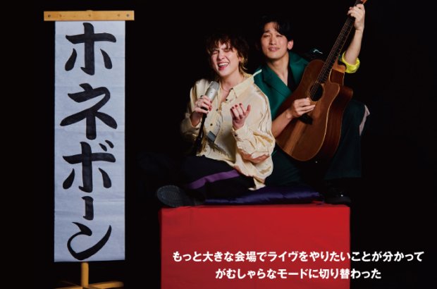 EMILYのパワフルな歌声とKAWAGUCHIのアコースティック・ギターで、赤裸々な感情を表現し共感を呼んでいる、東京 高円寺出身のフォーク・デュオ、HONEBONE。昨年の結成10周年イヤーを経て新人の気分で再スタートを切った2人が、11月2日、SHIBUYA PLEASURE PLEASUREで、1年の集大成となるホール・ワンマン・ライヴ"HONEBONE ホールワンマンライブ2025「人生まるごと全肯定‼」"を開催する。2025年リリースのアルバム『ドーン』や11月のライヴ、同公演に向け制作した新曲「やっても歌」について、話を訊いた。