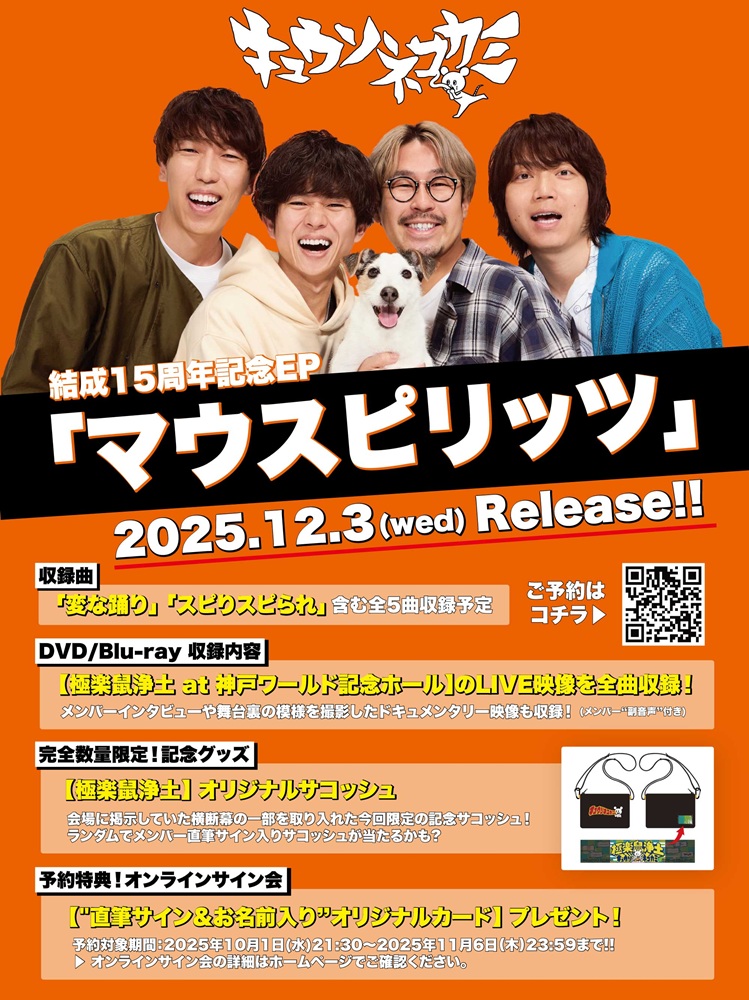 今年で結成15周年を迎えるキュウソネコカミ。先日発表された、12月3日にリリースされる結成15周年記念EP『マウスピリッツ』の詳細が公開された。