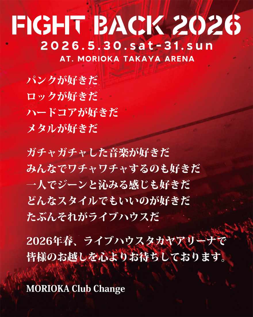 盛岡Club Change主催のアリーナ・イベント"FIGHT BACK 2026"が、2026年5月30日、31日の2日間にわたり岩手 盛岡タカヤアリーナで開催されることが決定した。