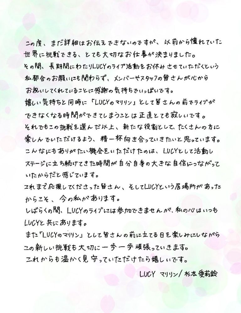 今回の活動休止は"マリリン自身が今後の活動や将来を見据え、新たな挑戦に向けて時間を設けることが最善であると判断したため"とし、マリリンも自身のSNSにて"少し先の未来に向けて、ずっと憧れていたお仕事が決まりました。その間、LUCYのライブ活動を一時お休みさせていただくことになりました。"と述べている。コメントは以下の通り。