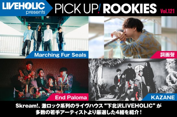"Skream!"と"激ロック"を運営する激ロックエンタテインメントによるライヴハウス、下北沢LIVEHOLICが、多数の若手アーティストの中から厳選したこれからに期待するイチオシの4組を"PICK UP! ROOKIES"と題して紹介。今月は、疾走感溢れるバンド・サウンドと、青春の情景を切り取ったようなキャッチーさが魅力の"Marching Fur Seals"、表現の再構築を掲げて"あねそかり"名義から改名、新章をスタートさせたSSW"詞画 聲"、重厚なラウド・サウンドからキャッチーなエモ、バラードまで、1バンドで5度美味しい"総合型ラウドRock"を目指す"End Paloma"、エモーショナル且つアグレッシヴなスクリームと儚くも美麗なクリーン・メロディを融合させた男女トリプル・ヴォーカルが特徴の"KAZANE"。個性溢れる4組を要チェック!