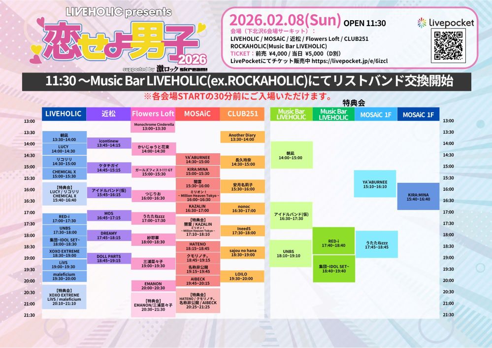 2/8開催下北沢LIVEHOLIC主催サーキット・イベント["恋せよ男子2026" supported by 激ロック & Skream!]、タイムテーブル公開