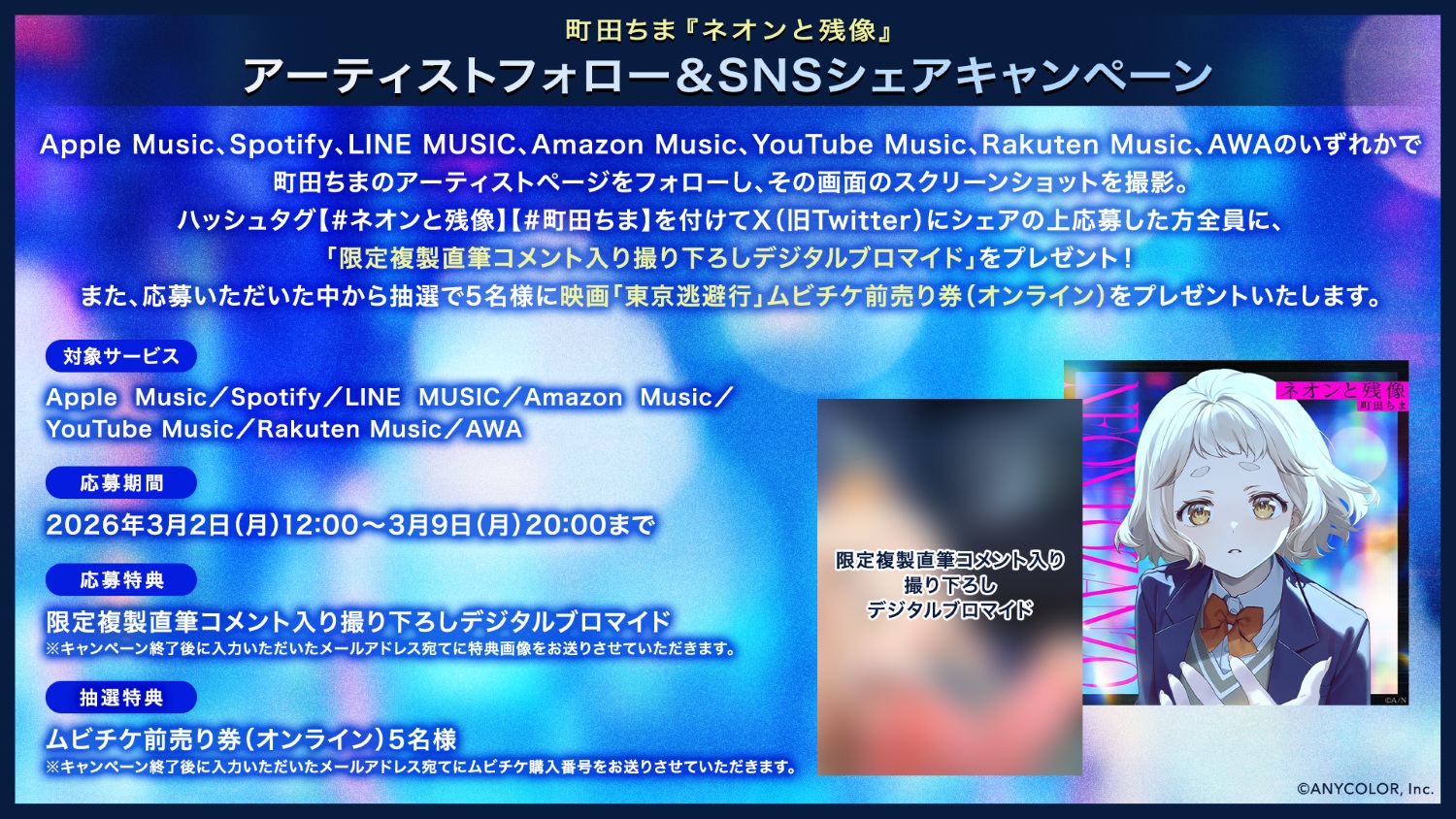 Apple Music、Spotify、LINE MUSIC、Amazon Music、YouTube Music、Rakuten Music、AWAのいずれかで町田ちまのアーティストページをフォローし、その画面のスクリーンショットを撮影。ハッシュタグ【#ネオンと残像】【#町田ちま】を付けてX(旧Twitter)にシェアの上応募した方全員に、限定複製直筆コメント入り撮り下ろしデジタルブロマイドをプレゼントいたします。